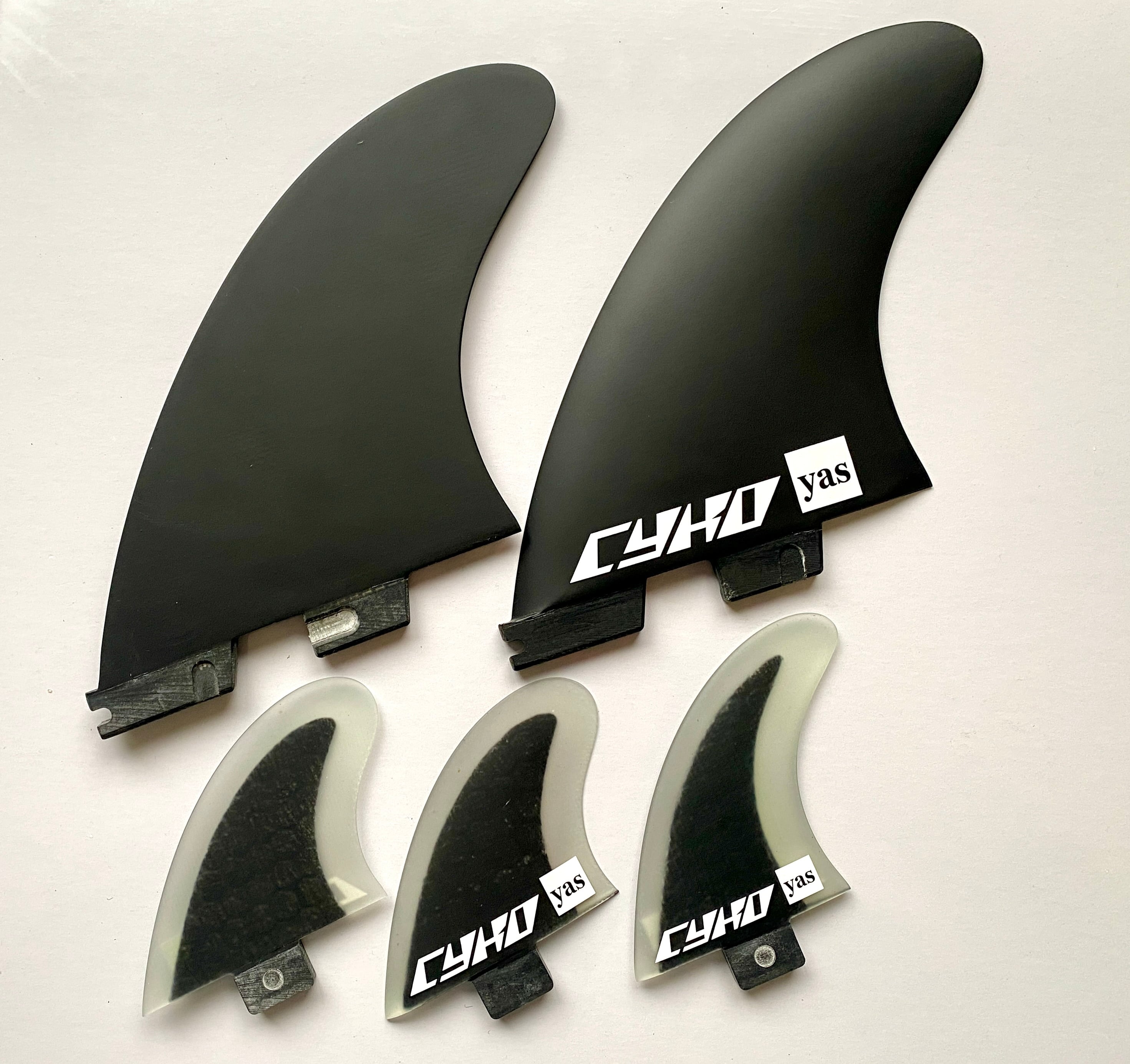新しい組み合わせのセットです。既存のyas ブラックシールドカーボン➕yasマルチのハニカムスタビ達!サイドフィンとなるブラックカーボンは既存のyas Twinよりやや小さく設計されている(写真3枚め4枚目の比較写真)のでさらに小波での取り回しの良さを可能にしました。スタビ仕様、デュアルスタビ仕様とも上々なテスト結果で小波ボードのみならずオールラウンドショートやハイパフォーマンスショートにセットしてもそのポテンシャルを発揮いたします